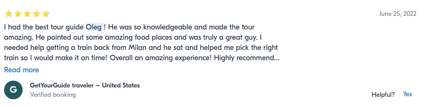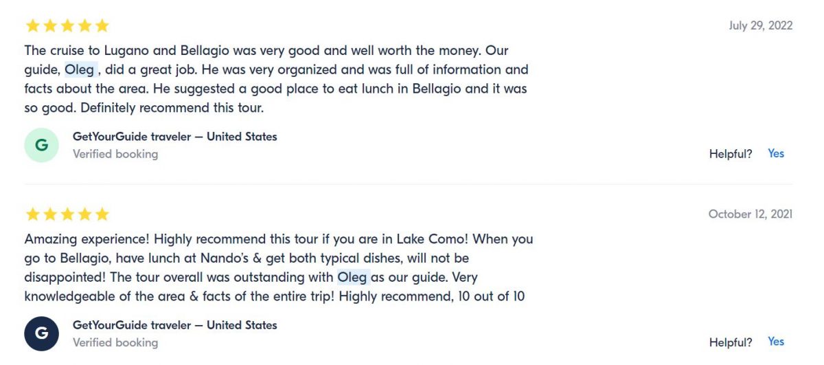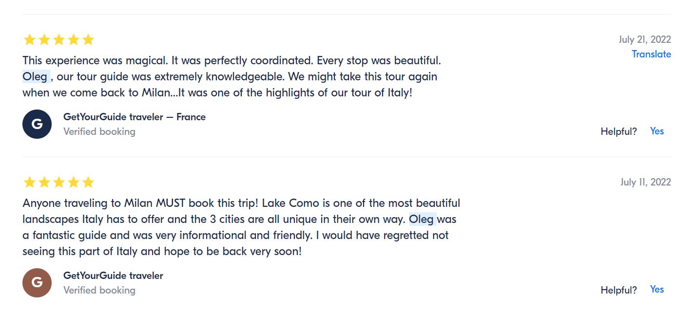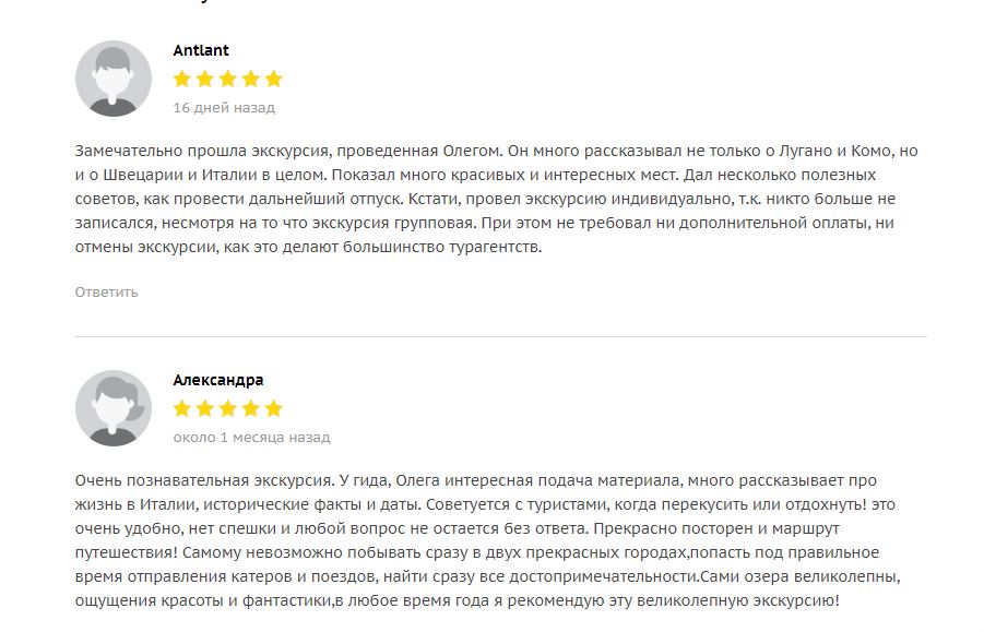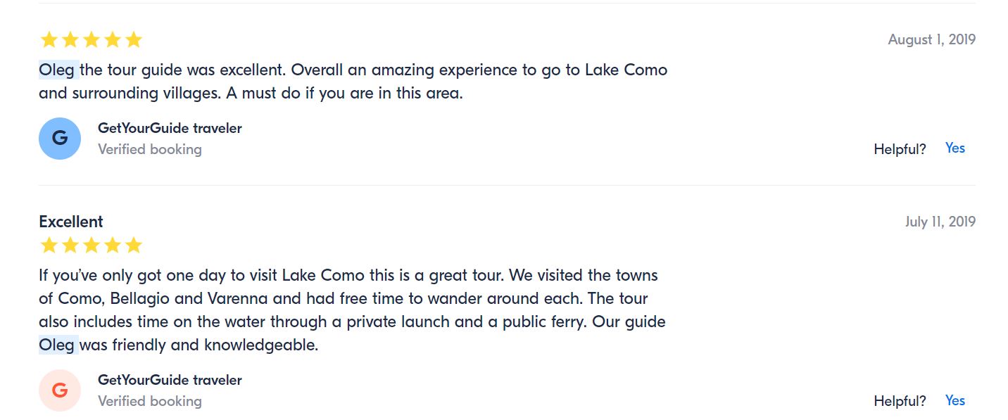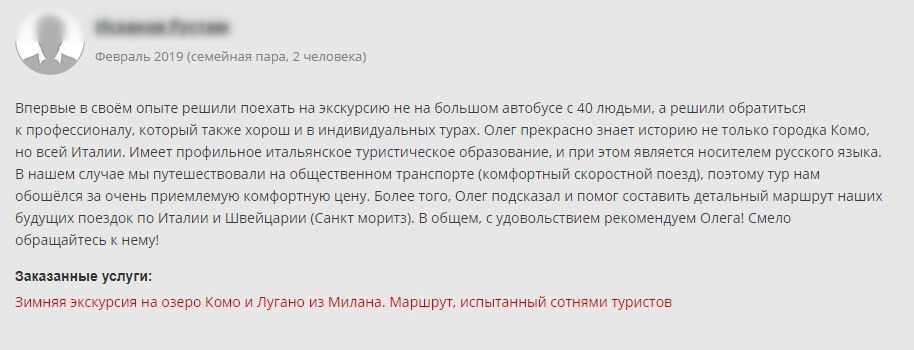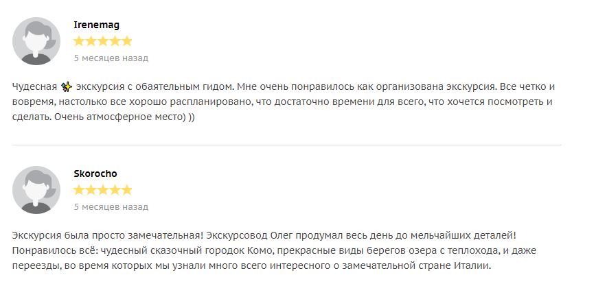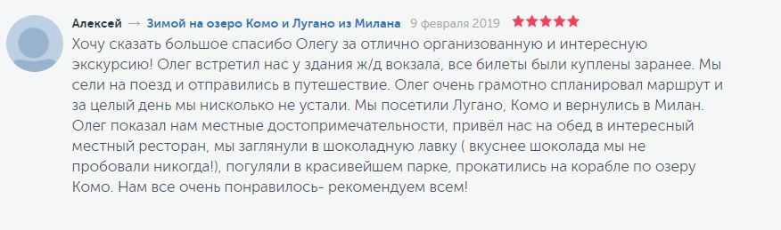 - Если поищите в гугле “Экскурсия на озеро Комо из Милана”, то на первых страницах поиска найдете именно мои предложения на которые мои туристы оставили более 120 хороших отзывов. Вот, что они пишут ….